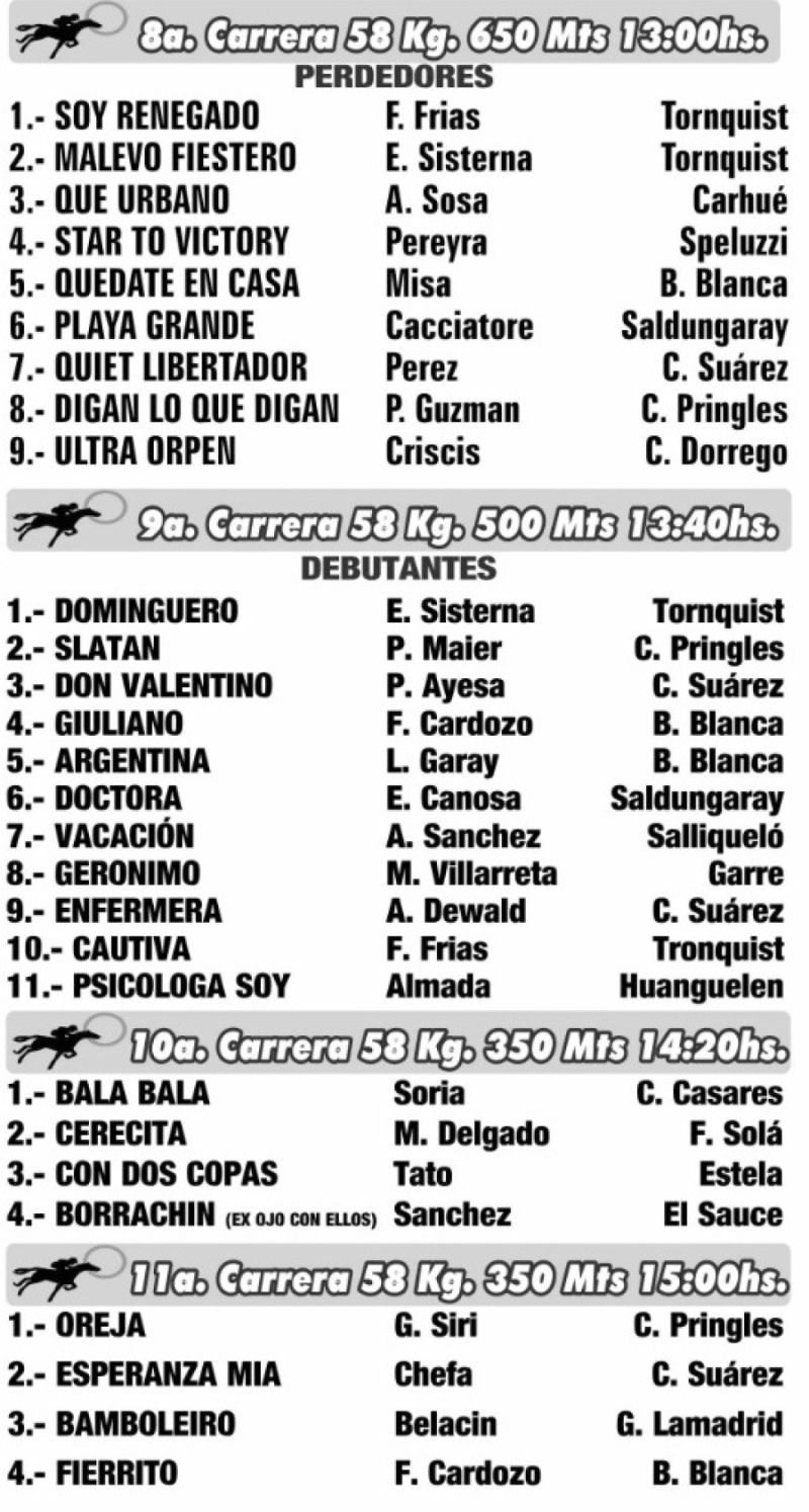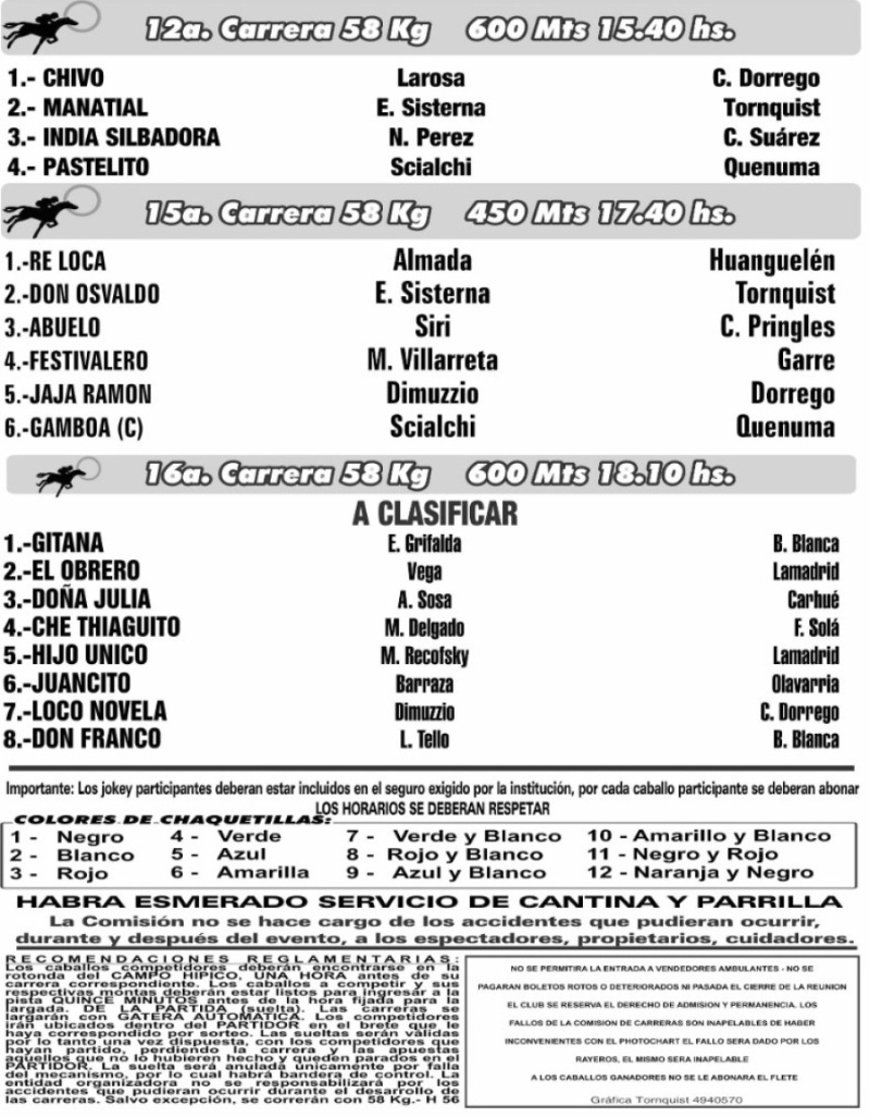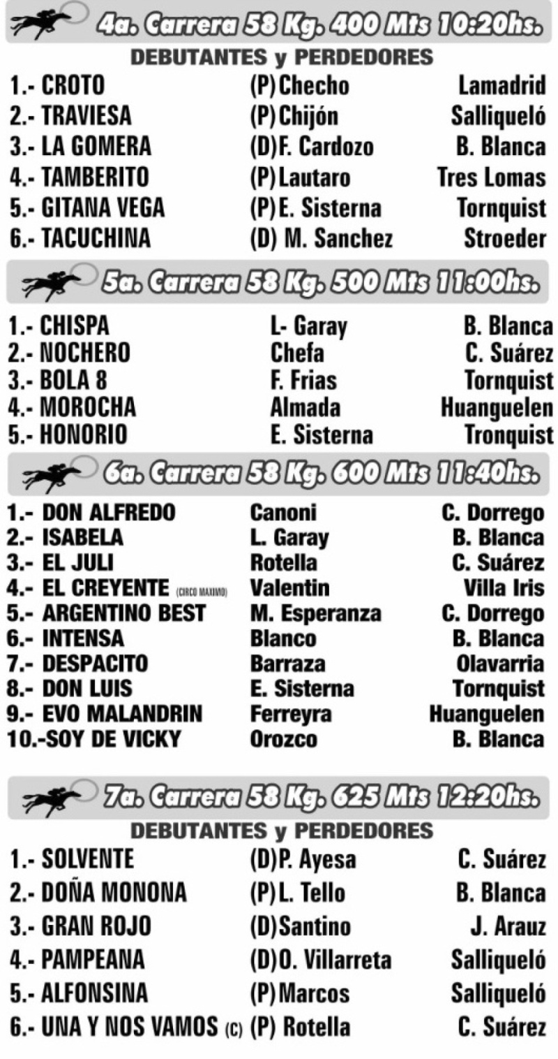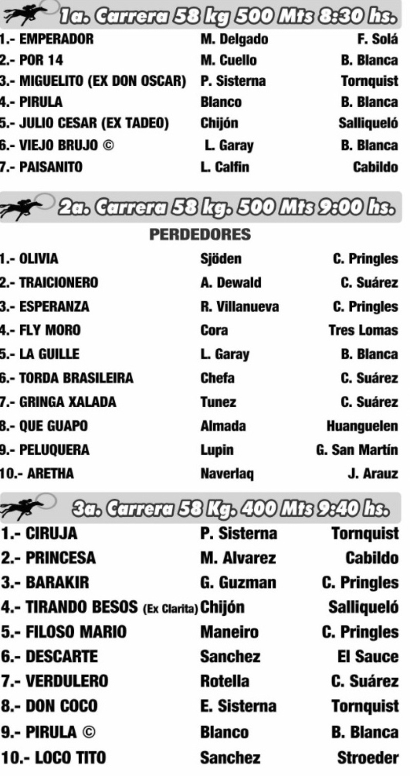 PRIMERA CARRERA: Distancia 400 metros: 1) CUCARACHA (Elva - Sierra Grande). 2)...