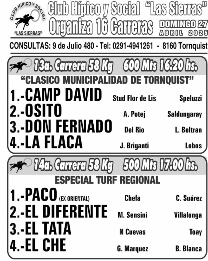 Trece de las quince carreras programadas se llevaron a cabo este domingo en el Club Hípico y Social "Las Sierras" de Tornquist en lo que fue una nueva jornada organizada por los pringlenses...