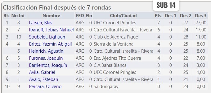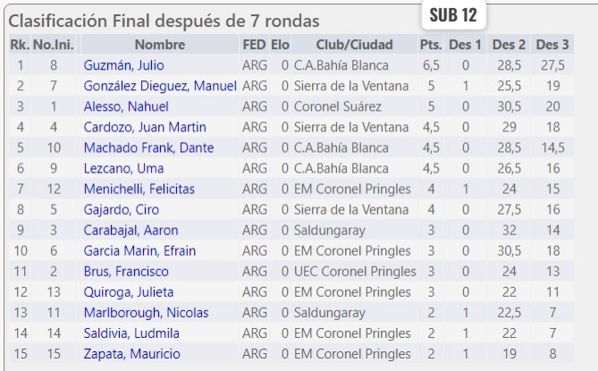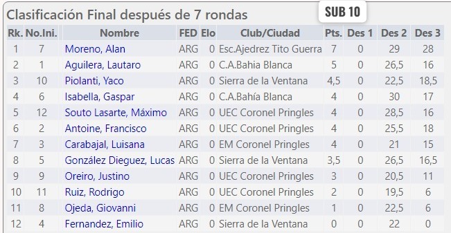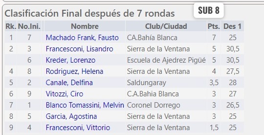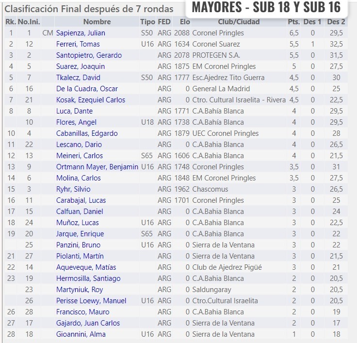 Un total de 74 ajedrecistas se acercaron a Sierra de la Ventana y este fue el resultado en las siguientes categorías ( las mayores, sub 18 y sub 16 compitieron dentro del mismo torneo y luego dividen según categoría).