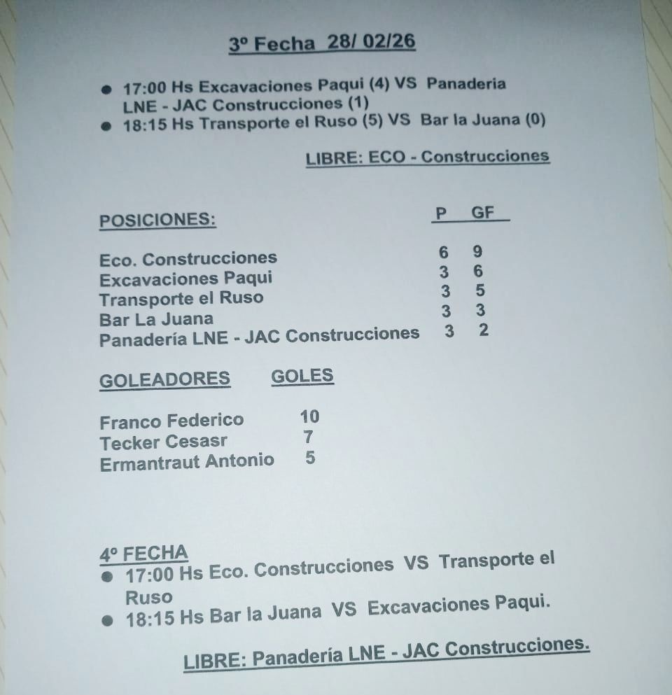 En el otro encuentro hubo un claro triunfo por 5 a 0 de Transporte El Ruso ante Bar La Juana. Tuvo fecha libre Eco Construcciones.