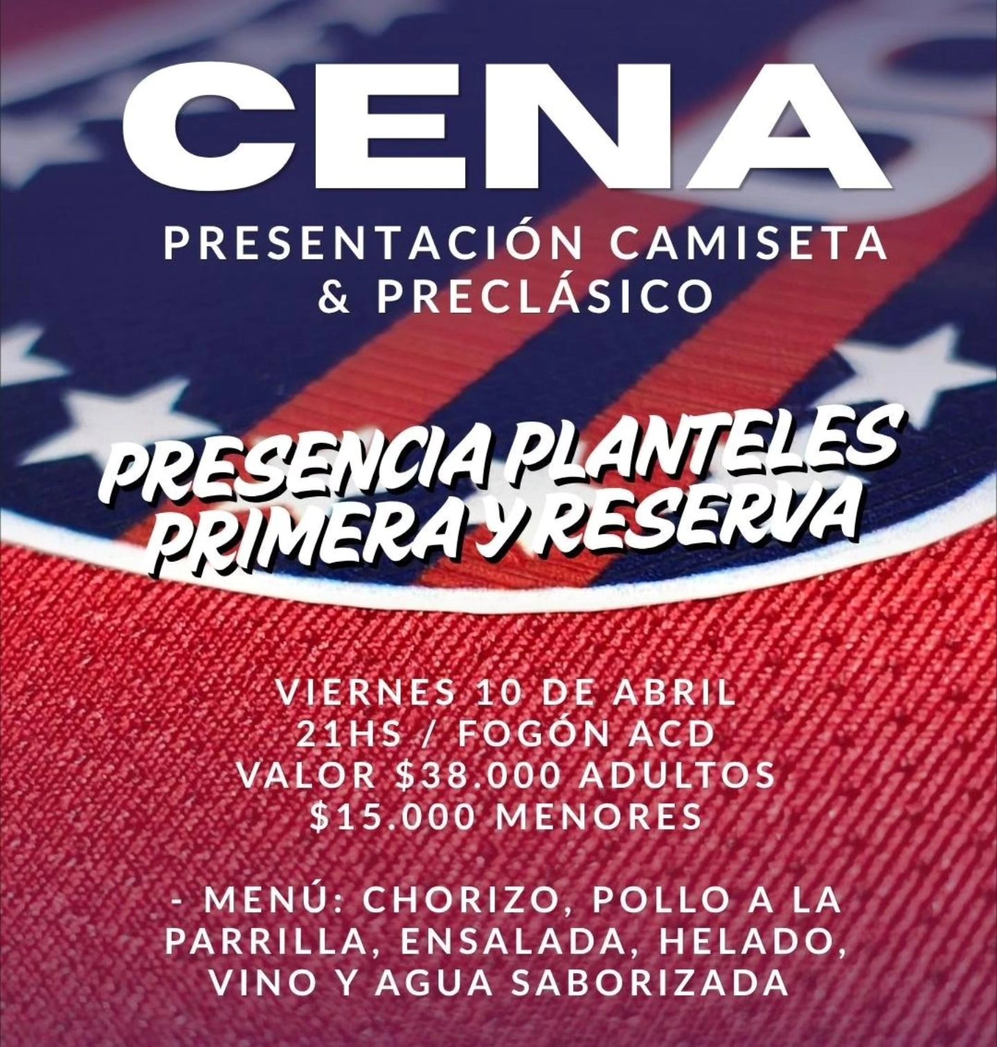 La cena consistirá en chorizo, pollo a la parrilla, ensalada, helado, vino y agua. Tendrá un costo de $ 38.000 para los mayores y $ 15.000 para los menores.