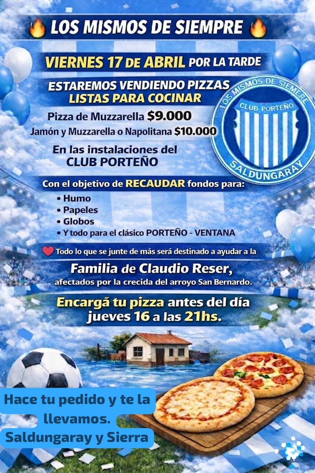 El Club Porteño de Saldungaray llevará adelante una venta solidaria de pizzas con el objetivo de recaudar fondos para distintas actividades del club y, al mismo tiempo, colaborar con una familia afectada por la crecida del arroyo San Bernardo.