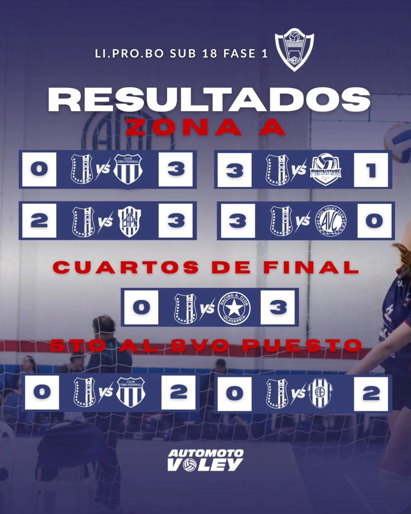 El equipo femenino Sub 18 del Automoto Club Deportivo finalizó octavo en la Fase 1 de la Liga Provincial Bonaerense de Vóleibol (Liprobo), disputada durante el fin de semana en la ciudad de Azul y que contó con la participación de 13 equipos de diferentes puntos de la zona sur.