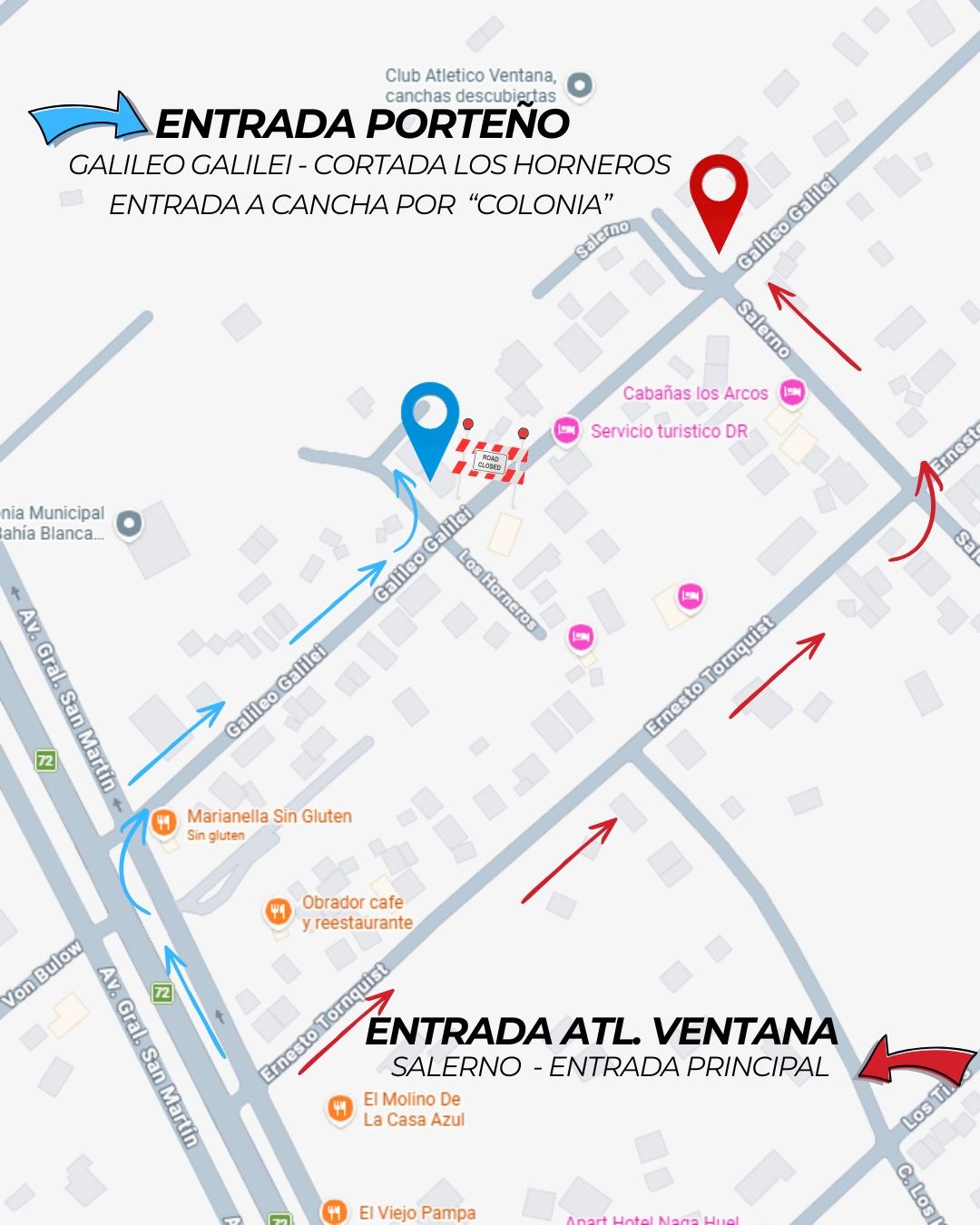 El público local deberá ingresar por el acceso habitual sobre calle Salerno, correspondiente a la entrada principal del club. En tanto, la parcialidad visitante tendrá su ingreso por calle Galileo Galilei, accediendo a través de la cortada conocida como “La Colonia”, ubicada a mitad de cuadra.